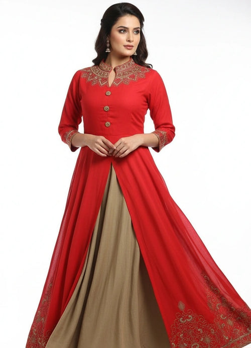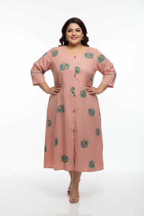 This is a clean, no-nonsense Anarkali kurta made for everyday wear, not drama. Soft ivory base with subtle floral prints on the yoke keeps it classy and wearable. The round neckline with wooden-style buttons adds a simple ethnic touch without looking heavy. Three-quarter sleeves and a flared fall give comfort and movement, not stiffness.
